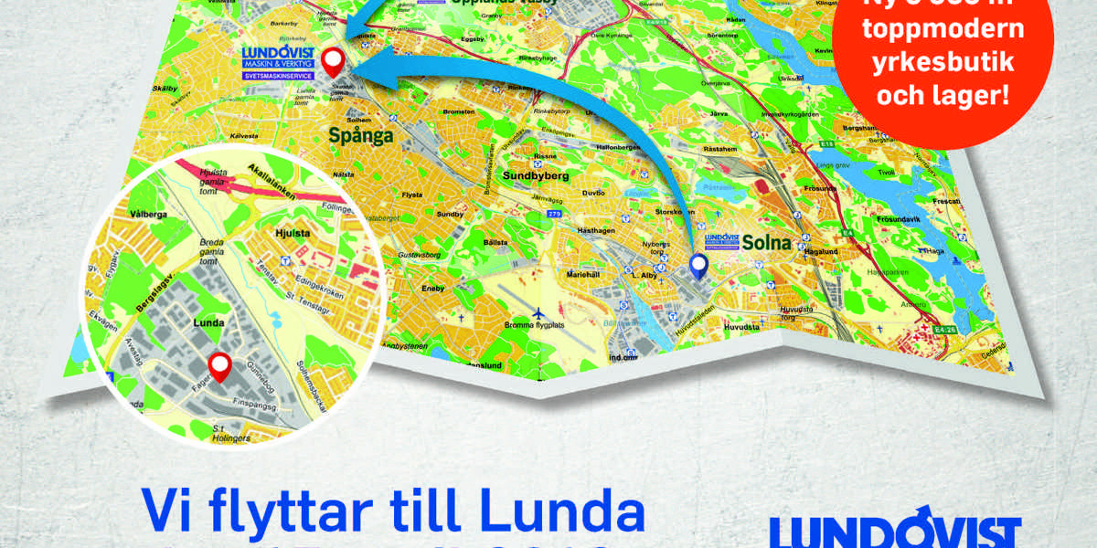 Fra og med 15. april vil Lundqvist Maskin & Verktøy samle sin kompetanse i nye lokaler i Fagerstagatan 21 i Lunda industriområde, Spånga. For kundene betyr det at de får tilgang til 5 000 m2 topp moderne fagbutikk og lager. Det gjør at de kan tilgodese kundenes behov enda bedre, med et bredere sortiment og raskere leveranser med mer enn 21 000 lagerførte artikler. På den nye adressen vil kundene som vanlig finne det meste innenfor maskiner, verktøy og sveising. I tillegg blir det et profesjonelt serviceverksted og et moderne opplæringslokale, samt et rasjonelt og utvidet gassdepot. Virksomheten i Solna og Upplands Väsby stenger og slås sammen på den nye adressen i Spånga. I Västberga blir de imidlertid værende som vanlig.